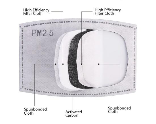 The mask is made of three layers of cotton; an outer coloured layer, a soft white liner, and an internal sleeve that allows a disposable filter to be inserted. Each mask comes with 2.5 micron 5 layer activated carbon disposable filters. Additional filters can be purchased.